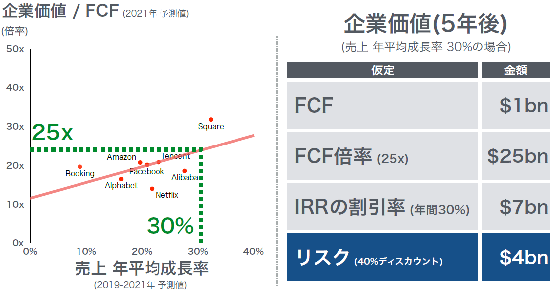 GAFAを初めとする安定期に入ったIT企業は、平均すると「FCFの25倍の企業価値」があり、またそうした会社は「年30%の売上成長率」があるので、将来、例えば5年後に年$1bnのFCFを生み出す(=$25bnの企業価値がある)企業の現在価値は$7bn、リスクを見ても$4bnなら買いだ、ということを説明会の中で言っています。